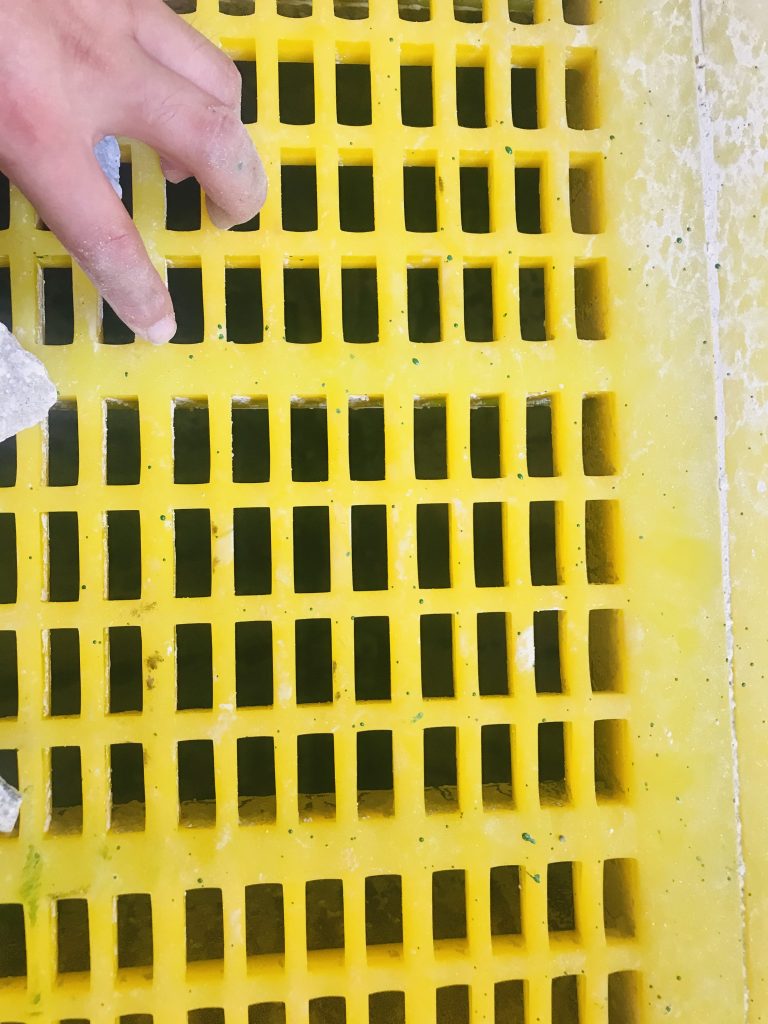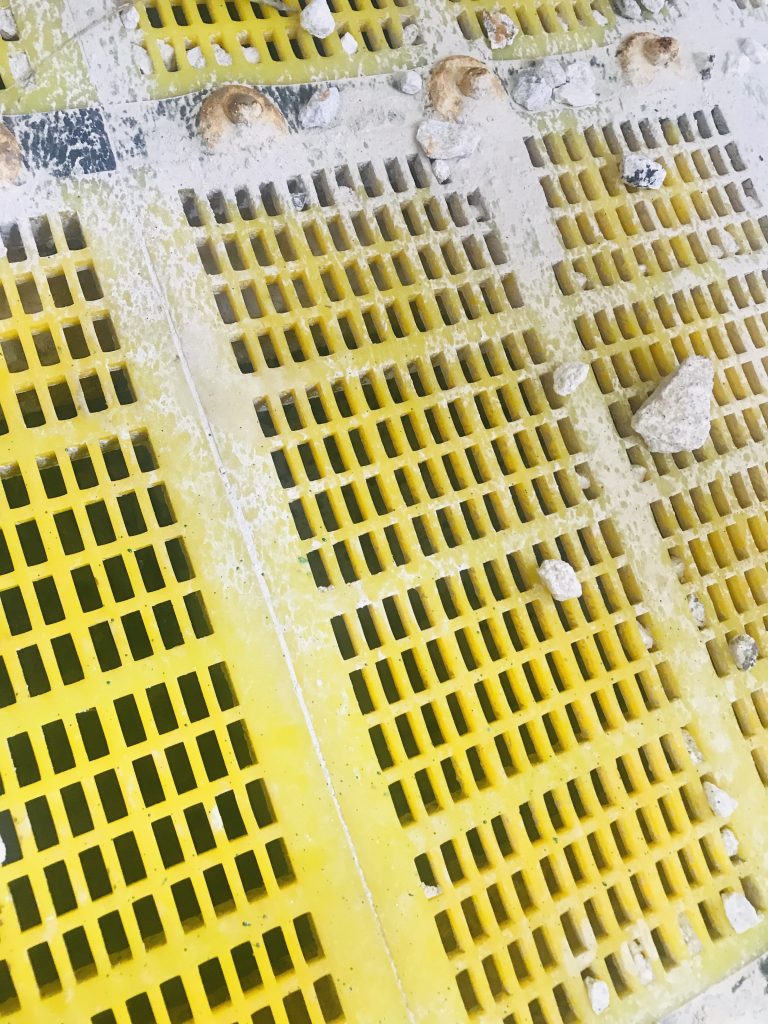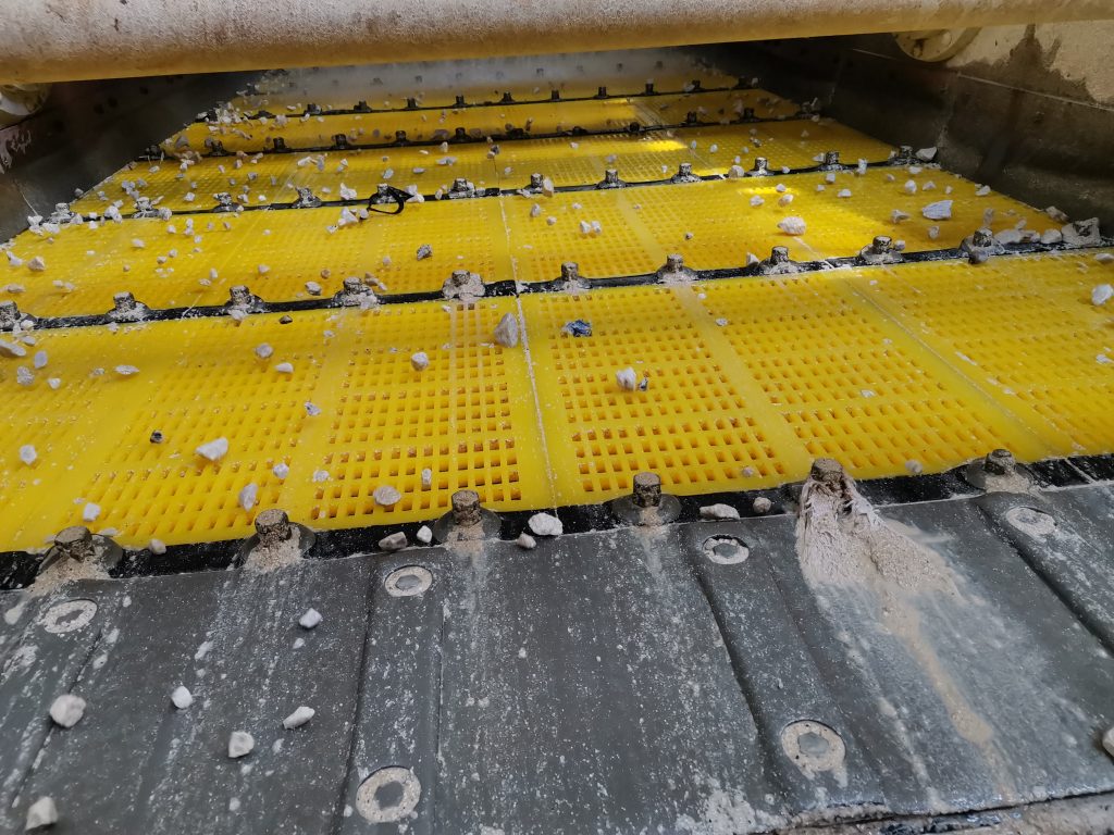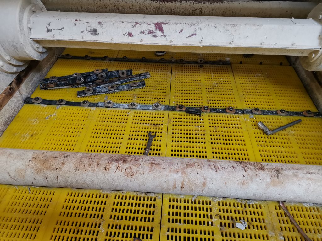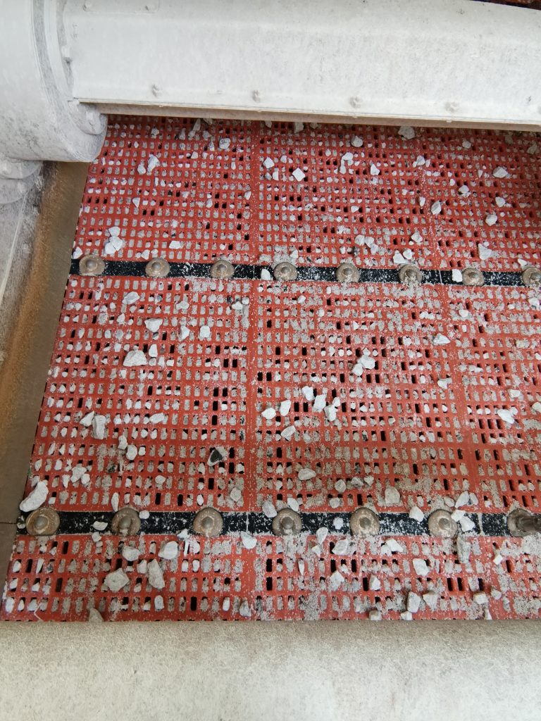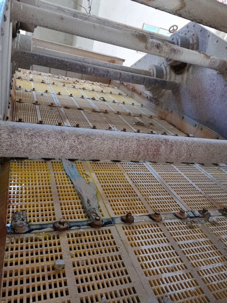 ? ? 2019年12月,南昌鑫力技術(shù)人員走訪宜春鉭鈮礦時(shí),了解到現(xiàn)場使用的一臺(tái)2460直線篩具有篩網(wǎng)堵孔、使用壽命低等影響篩分效率的問題,這個(gè)問題困擾了宜春鉭鈮礦的工作人員近十年,為解決篩網(wǎng)問題,他們先后使用過金屬?zèng)_孔篩網(wǎng)、不銹鋼條縫篩網(wǎng)、TDI聚氨酯篩網(wǎng),但都是“治標(biāo)不治本”。
